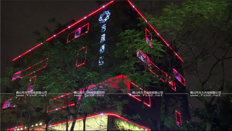 【应用领域】:灯光亮化【项目简介】:佛山市传承艺术酒店雄距于桂城街道聚元北路与佛平四路交汇处,与雄峰日产汽车专营店相邻,距怡丰城英皇影城只需步行5分钟即可到达,从佛山一环佛平路出口至平洲方向约800米,交通便利。 酒店按国家星级标准设计和建筑,把佛山特色与现代时尚元素完美结合,是本土首家以佛山文化为主题的精品型商务酒店。酒店拥有现代简约舒适客房、配有不同风格的棋牌室、中餐私房菜、餐厅粤式茶点、足球主题烧烤吧、私家停车场等等,是一间集商务及健康饮食、休闲于一体的精品商务型特色酒店,是您出行的理想之选。