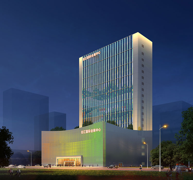 方向三:塔楼不变,裙楼 通过立杆装投影灯(裙楼 幕墙不作改变)。